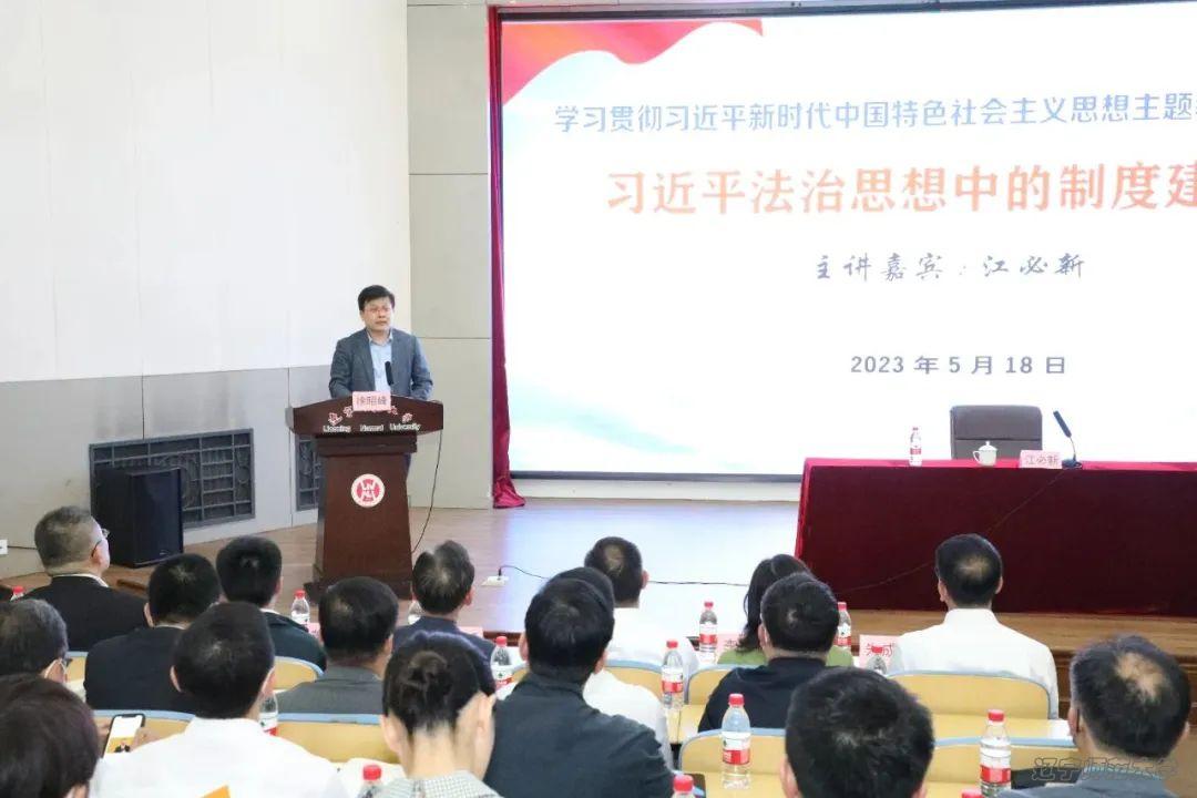 为深入推进v站体育官网学习贯彻习近平新时代中国特色社会主义思想主题教育,牢牢把握“学思想、强党性、重实践、建新功”的总要求,深刻领悟习近平新时代中国特色社会主义思想的真理力量和实践伟力,5月18日下午,v站体育官网在黄河路校区学术报告厅举办学习贯彻习近平新时代中国特色社会主义思想主题教育专题报告会,邀请全国著名法学家、中国法学会副会长江必新教授到校作专题辅导。本次报告会由v站体育官网与大连市法学会、大连市律师协会共同主办。大连市法学会、大连市律师协会代表,v站体育官网在连校领导,机关各部处、各二级单位党政负责人及师生代表共计300余人参加会议。徐昭峰副校长主持报告会。