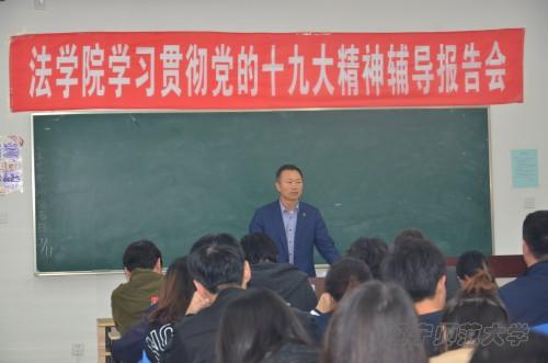 2017年11月7日下午两点,法学院党总支在法学楼605教室举办学习贯彻党的十九大精神辅导报告会,邀请马克思主义学院院长李玉珂教授为学院全体师生党员解读党的十九大报告的主要内容,进一步深刻领会、贯彻十九大精神。本次会议由法学院党总支书记冯俊勇主持。