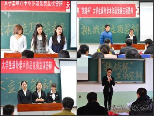 为了进一步提高v站体育官网参加 “挑战杯”赛事作品质量,促进校园科研学术交流氛围,12月10日,v站体育官网2017年“挑战杯”大学生课外学术作品竞赛立项答辩分别在理化楼C区与外语楼一合教室依据项目类别进行。评审组共分为四类五组:哲学社科组(A.B)、地理化学生科组、物理信息和科技发明组、法学组。