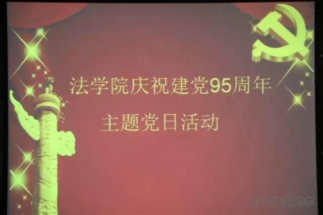 本次主题党日活动由法学院丁慧院长主持,参会人员包括法学院全体教工、学生党员。活动的开始,丁院长首先强调了在今天这个特殊的日子里,学校各级党组织举行的庆祝建党95周年系列活动的重要意义,阐明了在这95年波澜壮阔的历史进程中,中国共产党紧紧依靠人民,跨过一道又一道沟坎,取得一个又一个胜利,为中华民族作出的伟大历史贡献和取得的辉煌成就。