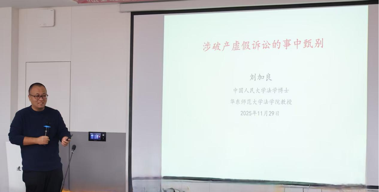 华东师范大学法学院刘加良教授在“涉破产虚假诉讼的事中甄别”主旨发言中,系统剖析了虚假诉讼向破产领域蔓延的趋势,指出其行为隐蔽、手段专业化的特征,强调需构建涵盖线索发现、调查取证、法律制裁与司法建议的全流程甄别与治理体系。