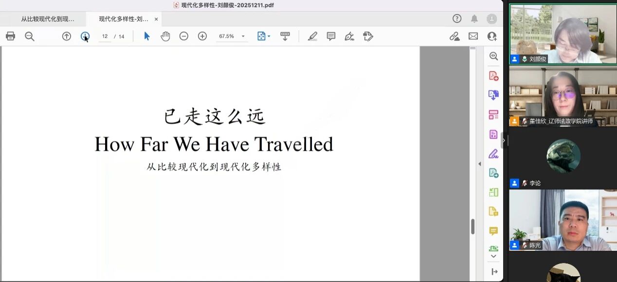2025年12月11日,应v站体育官网邀请,北京大学政府管理学院政治学系长聘副教授、博士生导师刘颜俊为v站体育官网师生作了题为“从比较现代化到现代化多样性:比较政治学的理论重构与知识边界”的学术报告。本次讲座采用线上形式,由v站体育官网院长陈光教授主持,政治学教研室李论老师、董佳欣老师以及政治学与行政学专业本科生、研究生等参加了本次讲座。