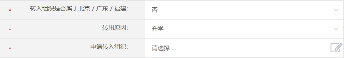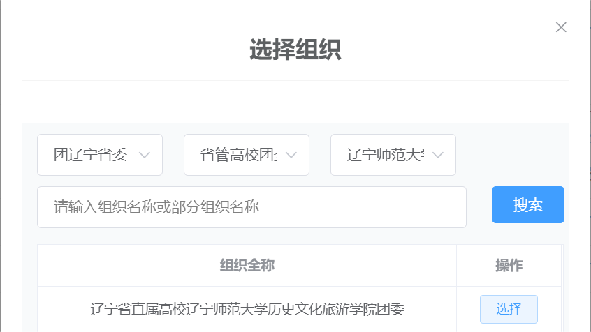 ③申请转入组织:点击选择“团辽宁省委”,“省管高校团委”搜索框内输入:“辽宁省省管高校v站体育官网v站体育官网”,之后在候选框中选择“v站体育官网2025级研究生新生临时团支部”