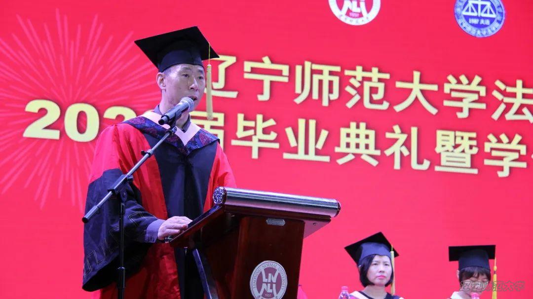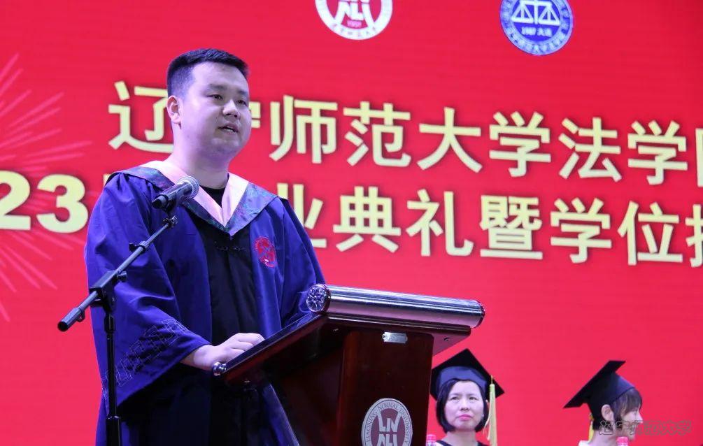 李成作为校友代表讲话。他向同学们讲述了自己毕业后从事律师职业的发展经历,用现实的案例勉励毕业生们离开母校后要继续努力,不能懈怠,百尺竿头,更进一步!